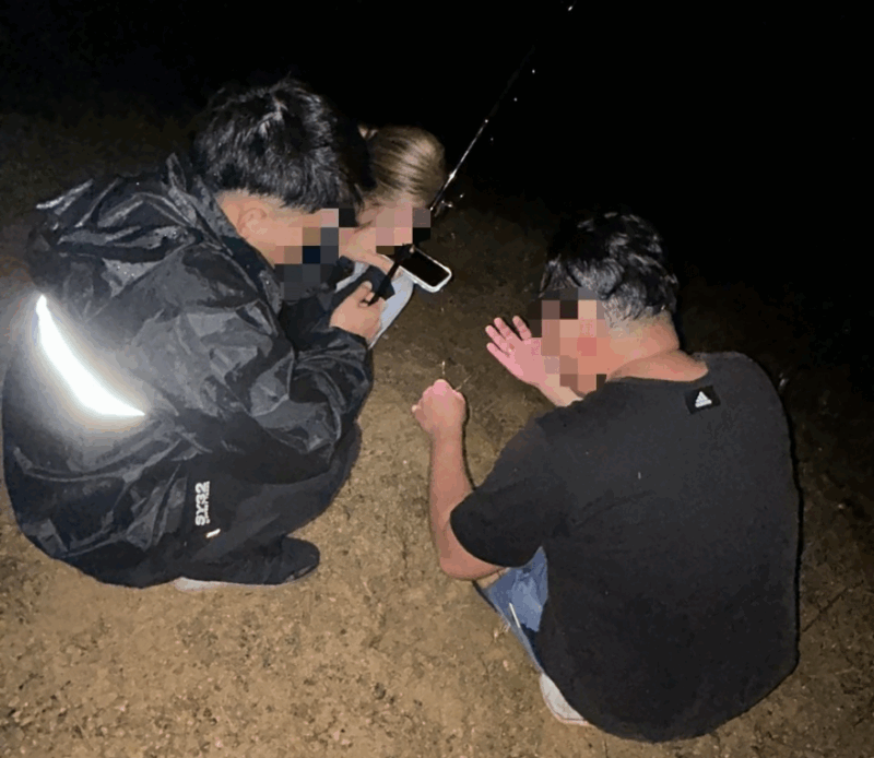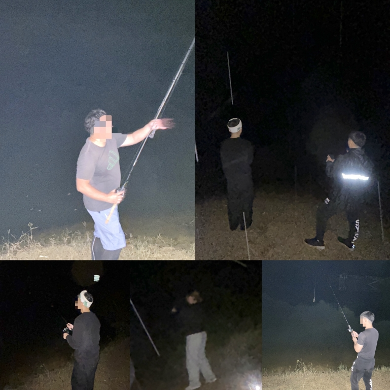 真っ暗闇の中、みんなで師匠を囲み竿の糸通しを教えてもらいました!